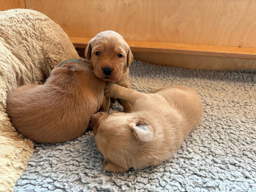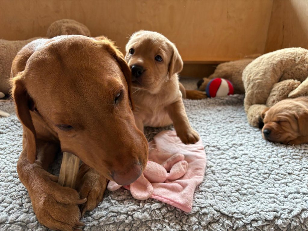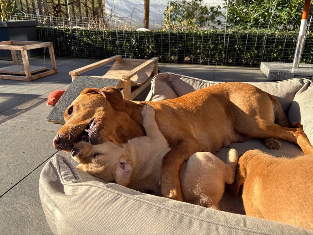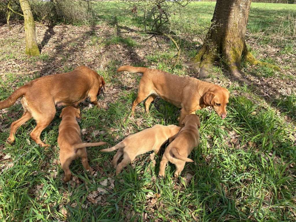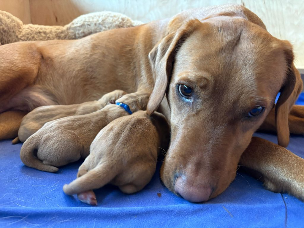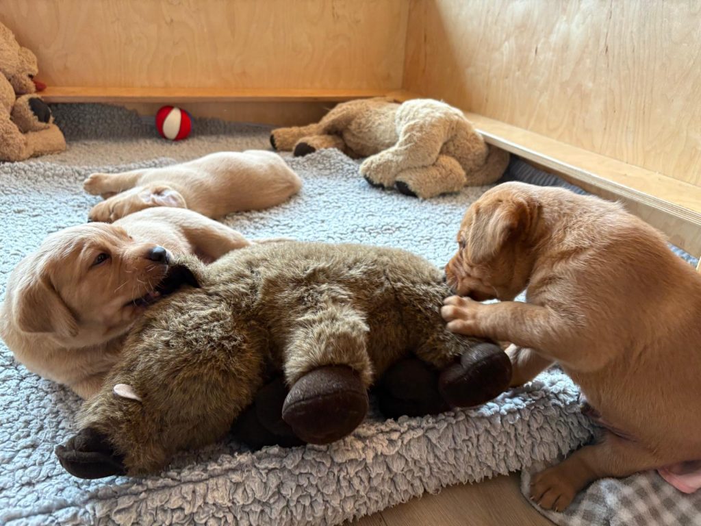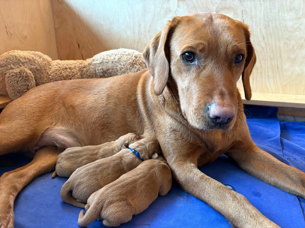 Am 11.2.2025 sind drei kräftige dunkelgelbe Rüden bei uns zur Welt gekommen. Wir sind sehr glücklich und dankbar, dass Joy und die Welpen gesund und agil sind. Calle freut sich sehr über seinen ersten Nachwuchs. Nun kommen fröhliche gemeinsame Wochen auf uns zu