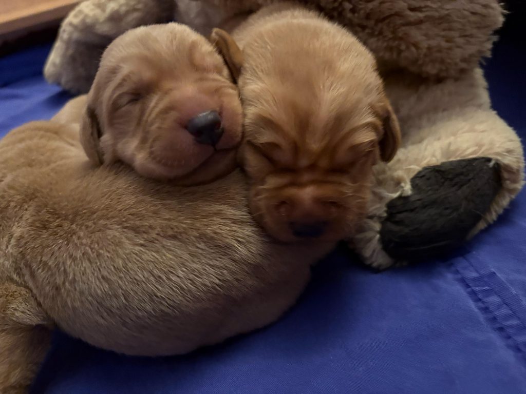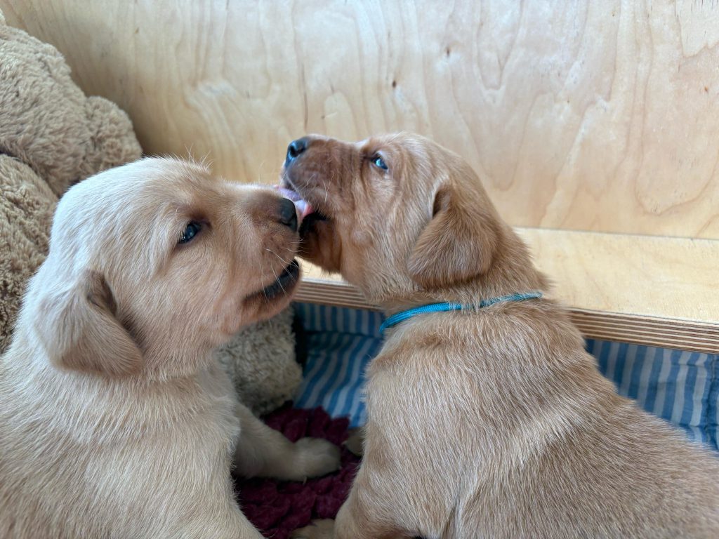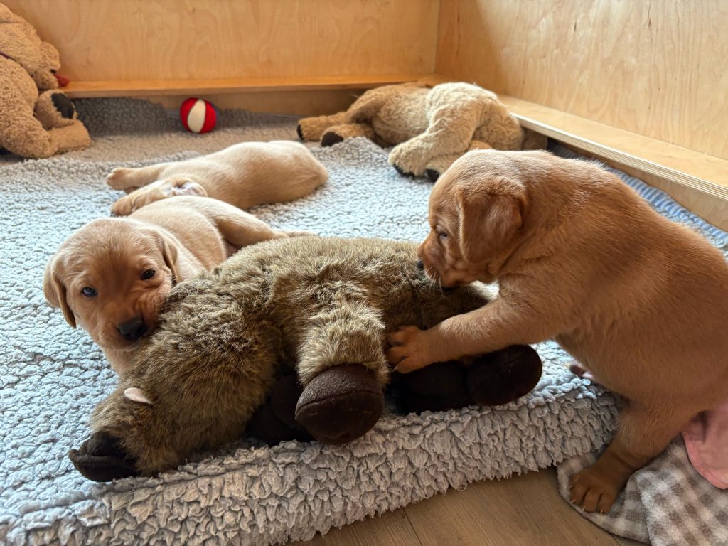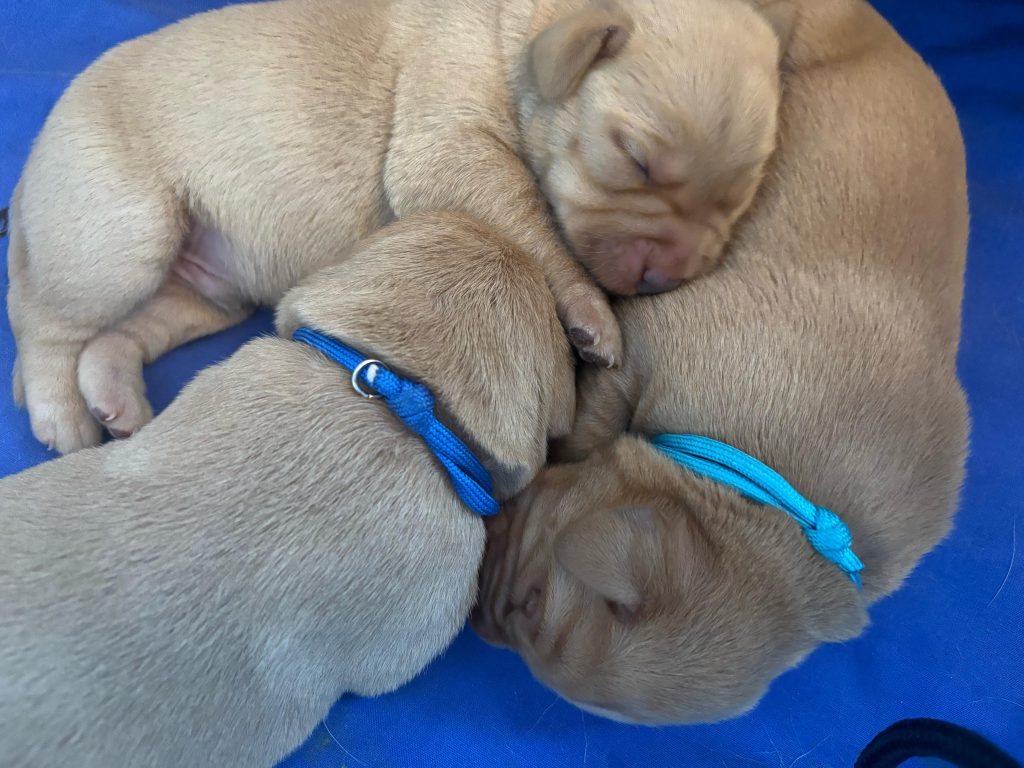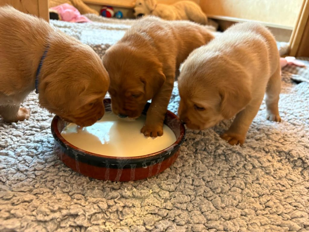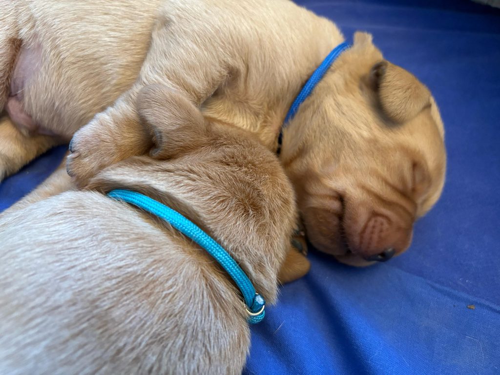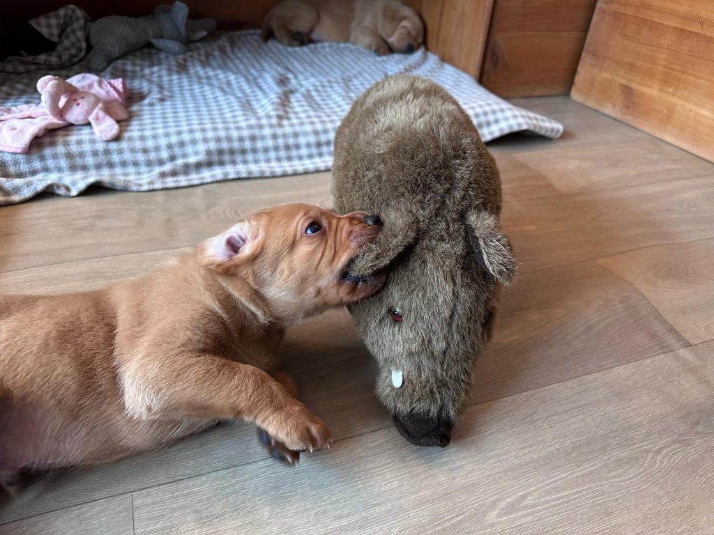 Am 11.2.2025 sind drei kräftige dunkelgelbe Rüden bei uns zur Welt gekommen. Wir sind sehr glücklich und dankbar, dass Joy und die Welpen gesund und agil sind. Calle freut sich sehr über seinen ersten Nachwuchs. Nun kommen fröhliche gemeinsame Wochen auf uns zu
